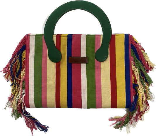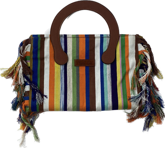 Inspirée du ballet des feuilles de palmiers au vent, la collection Fanci-Faso, alliance de cuir luxueux et de tissu, est le fruit d'une transformation d'étoles tissées sur métiers pour vous offrir des sacs d'été originaux, colorés et fonctionnels.